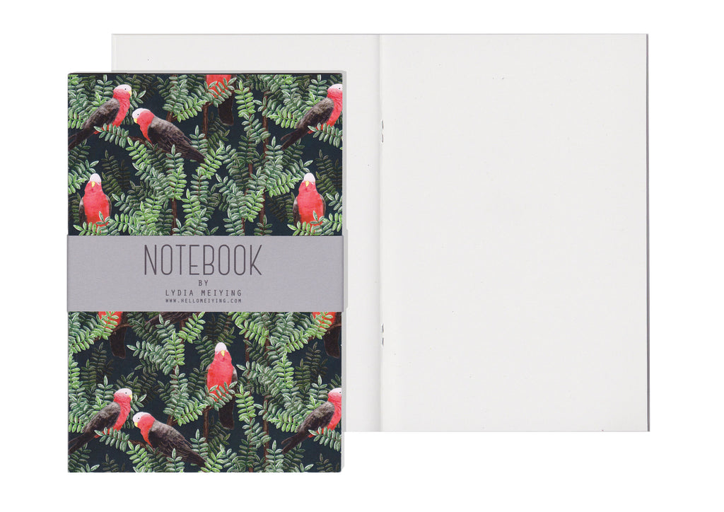 An A5 (148 x 210mm) notebook featuring a pattern of red galahs sitting in the trees amongst the foliage. A great size to carry around in your bag and perfect for jotting down notes, shopping lists and adventure plans.
