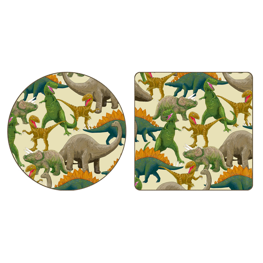 A fun coaster to protect your surfaces from hot and cold drinks. This coaster features a pattern of dinosaurs.