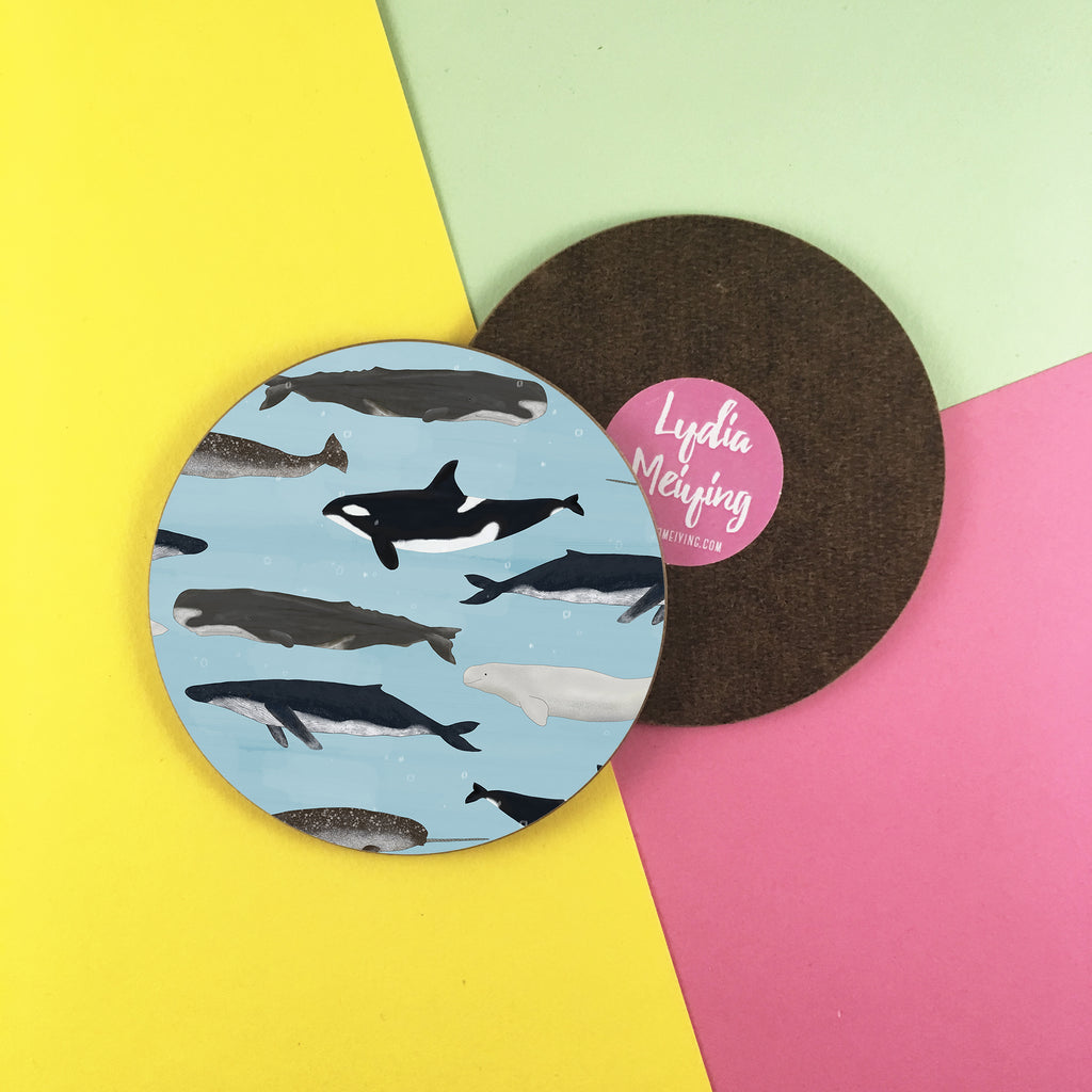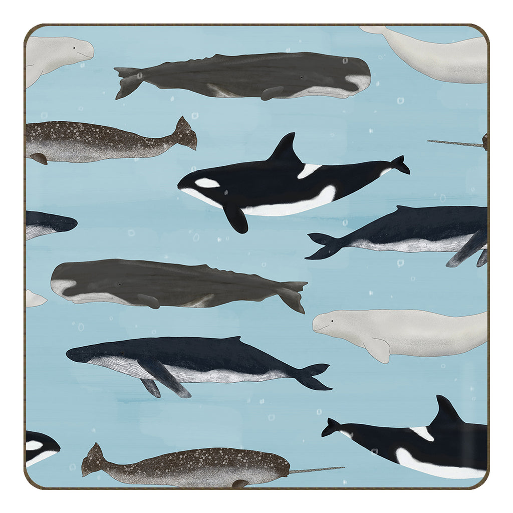 A coaster to protect your surfaces from hot and cold drinks. This coaster features a fun pattern of whales.