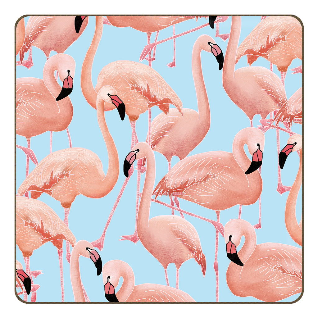 A coaster to protect your surfaces from hot and cold drinks. This coaster features a pattern of fun flamingos.