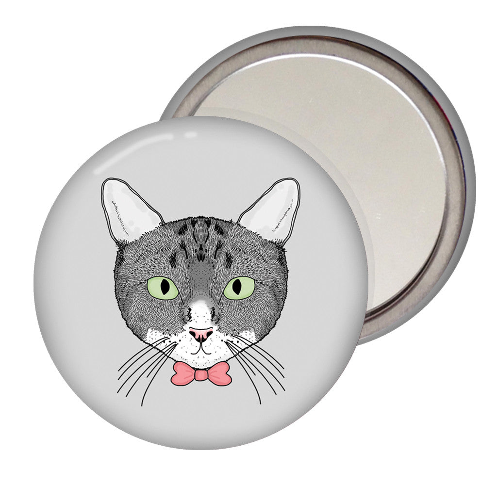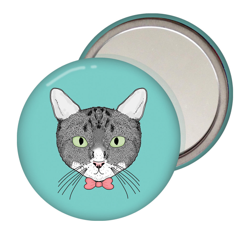 A cute pocket mirror to carry in your pocket, hand bag or purse. Featuring an adorable illustration of a cat on a choice of different background colours. A purrfect gift for cat lovers!