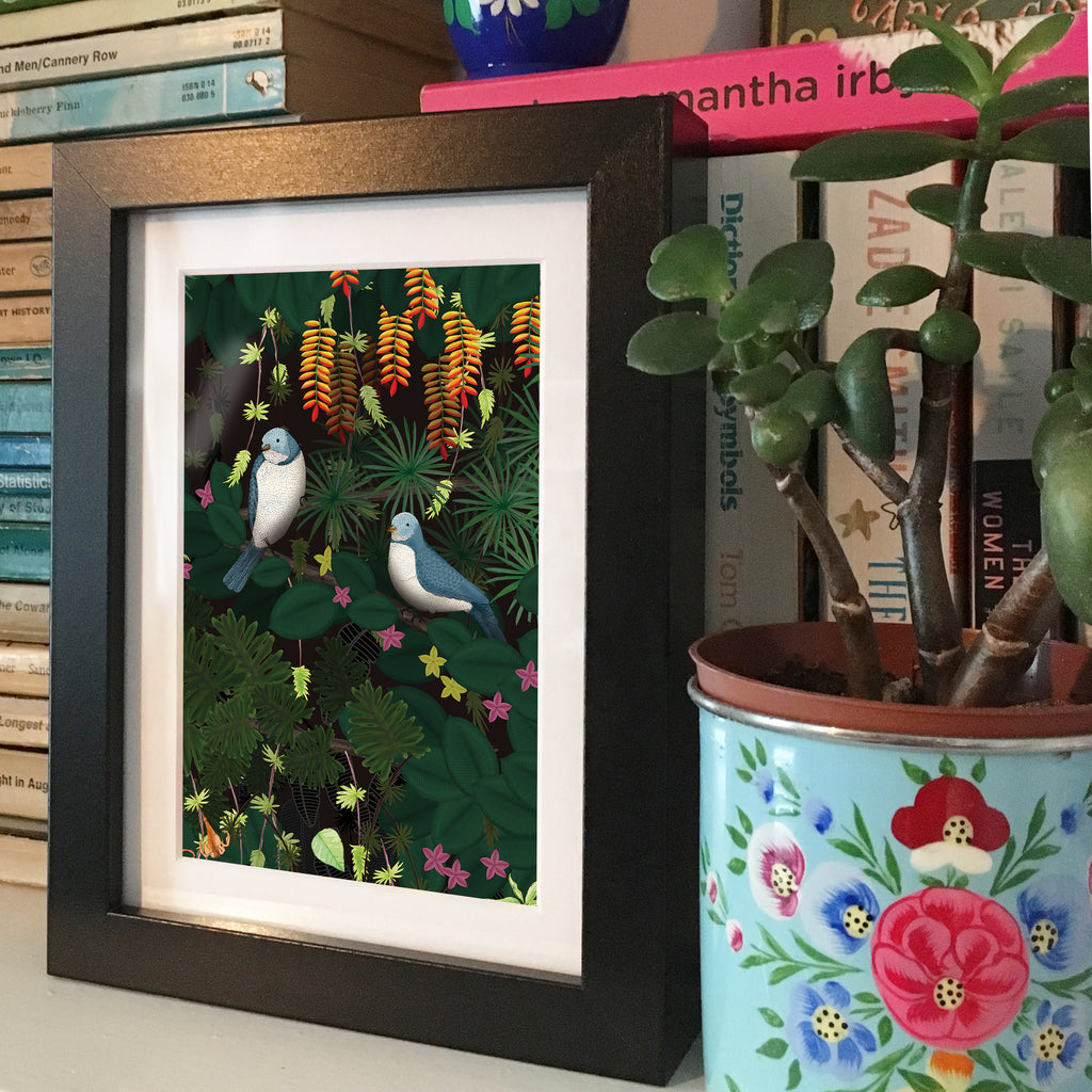 A fun print of a couple of birds sitting amongst the lush foliage. Ideal as a present for children's bedrooms (and adult bedrooms!), birthday's, housewarmings or as a treat for yourself.