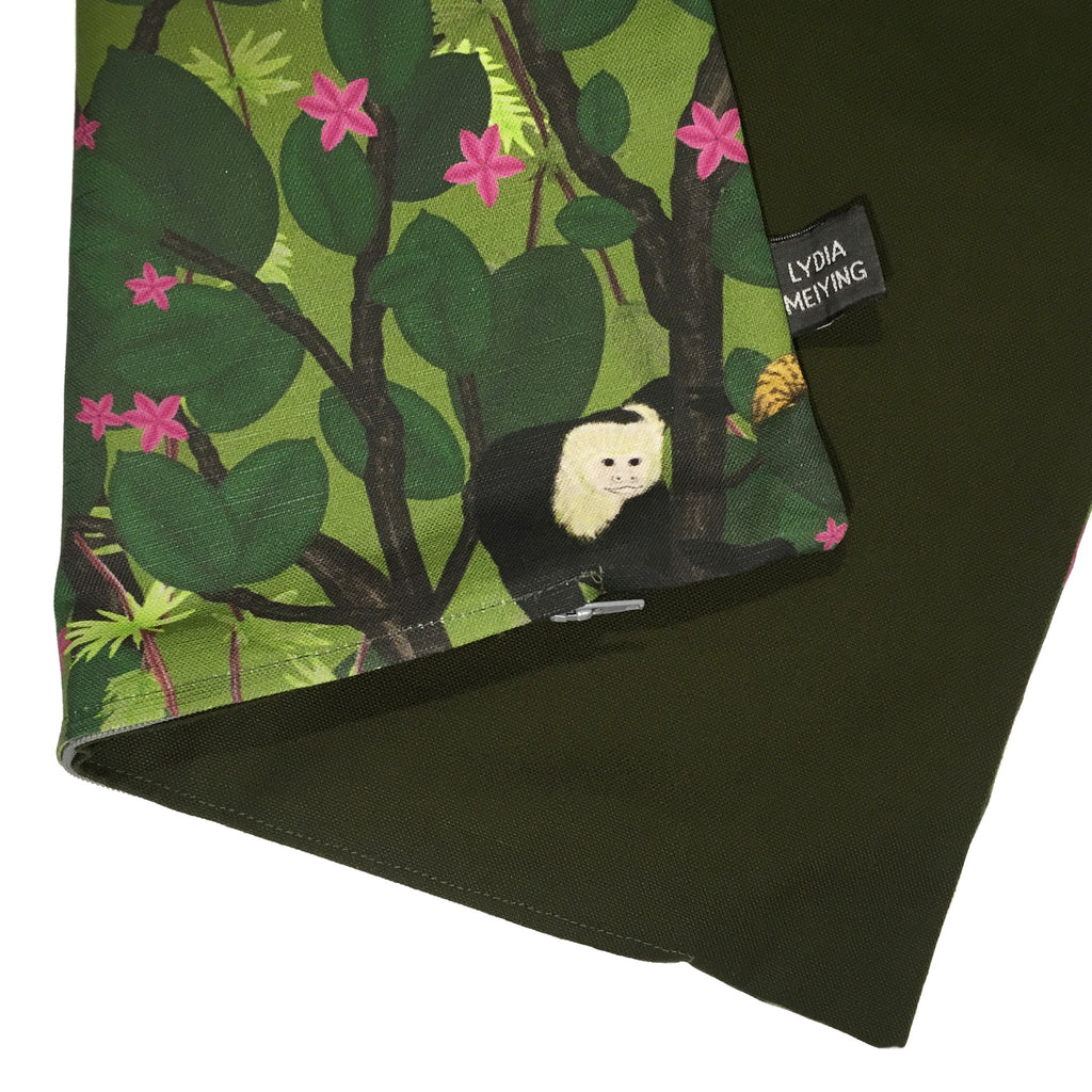 A patterned cushion cover featuring a hand drawn pattern of Cheetahs and Monkeys in the jungle. This cushion features a fully printed patterned front and plain dark khaki back with a concealed zip.