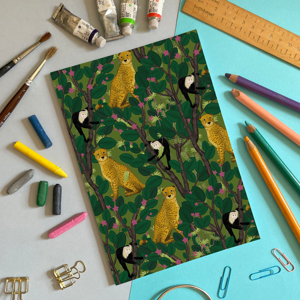 An A5 (148 x 210mm) notebook featuring a pattern of cheetahs and monkeys amongst the foliage. A great size to carry around in your bag and perfect for jotting down notes, shopping lists and adventure plans.